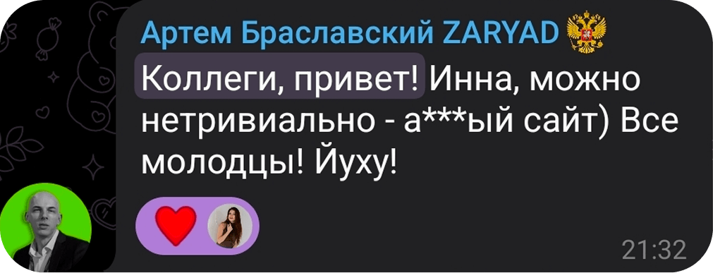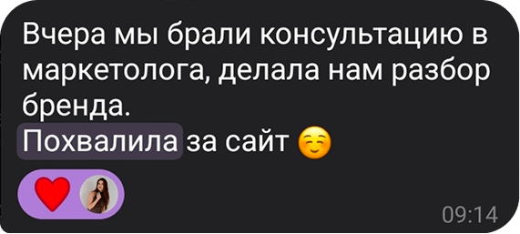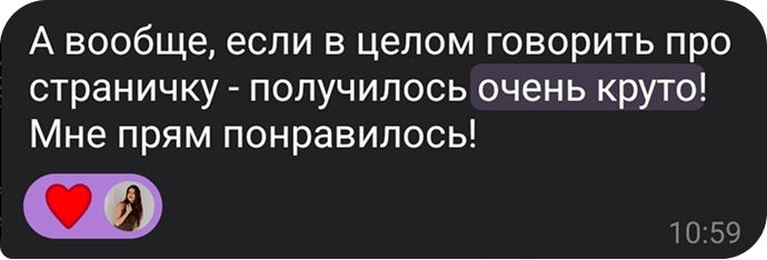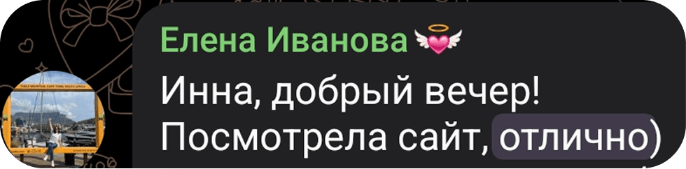 Главным показателем успешности работы стало то, что Инна продемонстрировала глубокое понимание нашей целевой аудитории и умение эффективно реализовывать поставленные задачи. Мы получили готовый сайт в полном объеме и точно в оговоренные сроки.